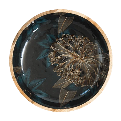 Op zoek naar een stijlvolle schaal om (zomerse) salades of andere gerechten te serveren? Dit exemplaar van By Room is er één voor op uw wensenlijst! Het item is vervaardigd uit mangohout en heeft een rond design met een diameter van 38 cm. De binnenkant is voorzien van een sticker met chrystantenprint voor een sierlijk effect. Combineer de schaal met het bijpassende slacouvert voor een elegant geheel.